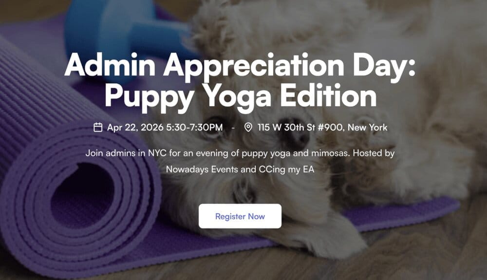 We’re collaborating with Nowadays to host a puppy yoga Admin Day event next Wednesday, April 22nd in NYC! 🧘