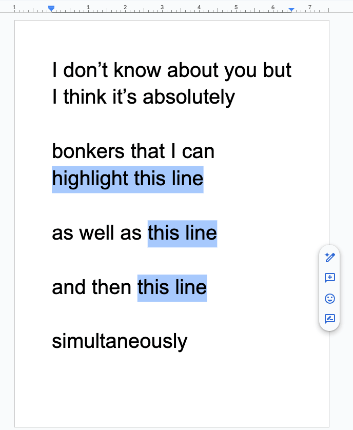 For example, check out this Google Doc of mine where I have totally separate lines highlighted!