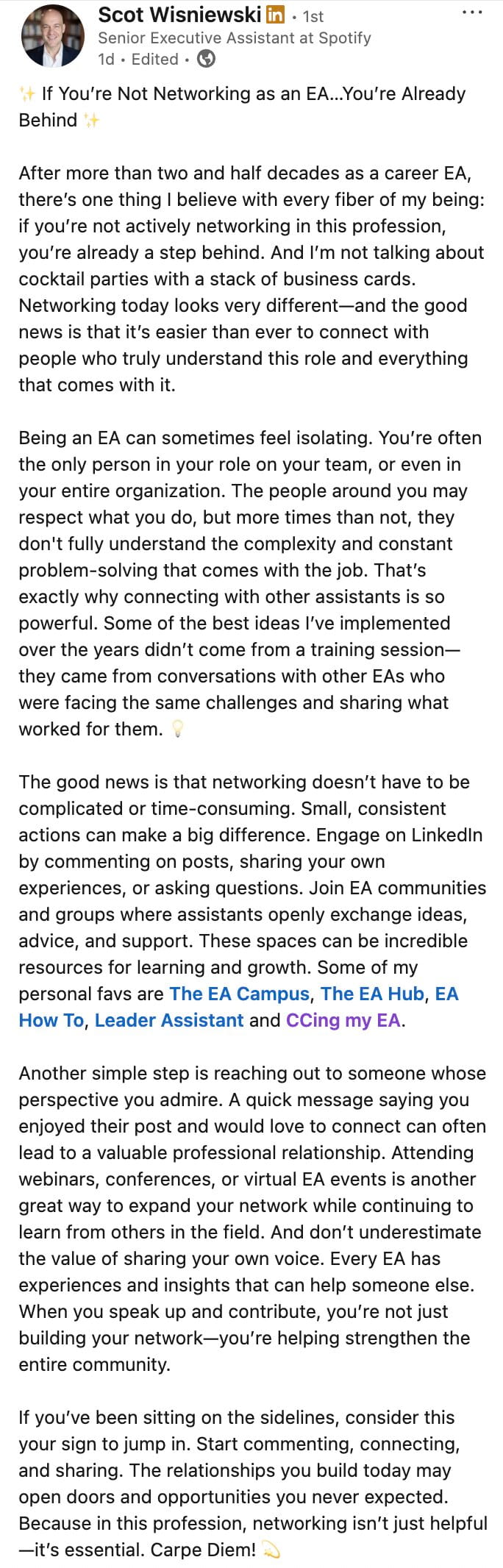 At a recent CCing my EA meetup, I heard something along the lines of “an EA’s best resource is another EA”, and it’s so true because they’re able to share relevant assets like vendors, tips, and tools with you.