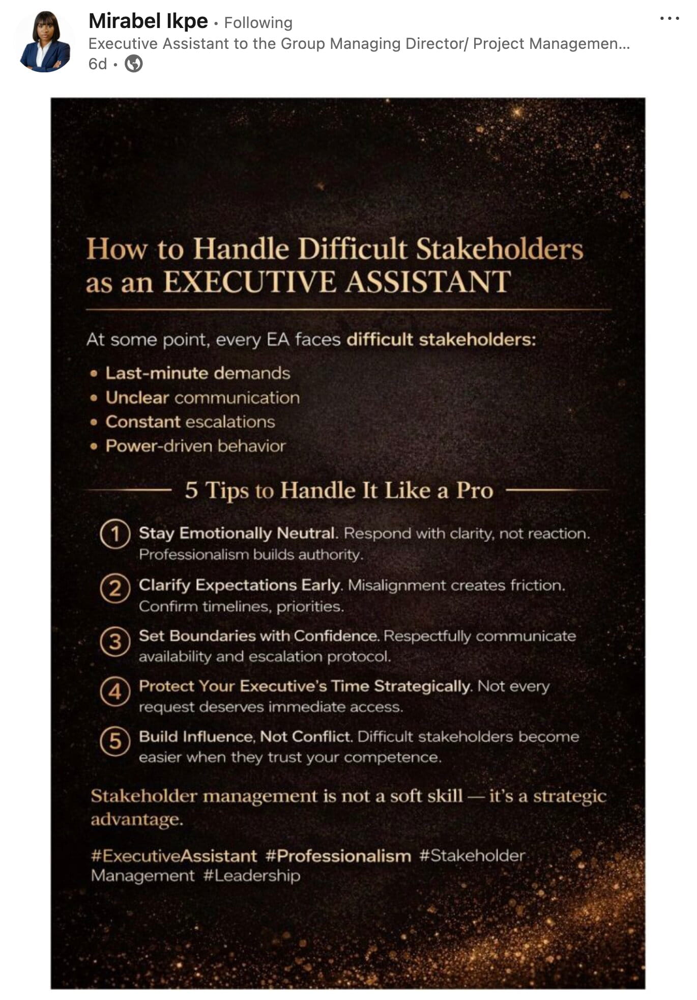 “Difficult stakeholders become easier when they trust your competence” stands out to me.